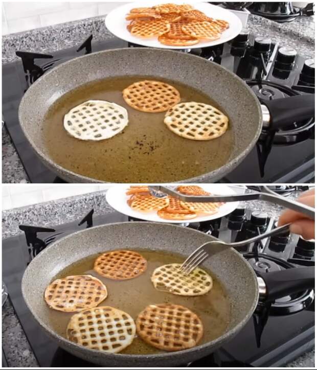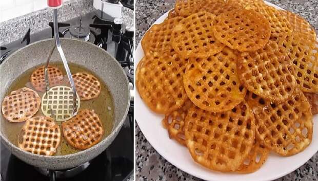 Несколько секунд ждем, пока ажурный шедевр отделится от пластины, оставляем его плавать в кипящем масле. Далее по такому же принципу делаем следующий кружочек. В том случае, если тесто прожарилось, но не отстает от платформы пресс-пюре, его следует поддеть аккуратно вилкой или ножом.