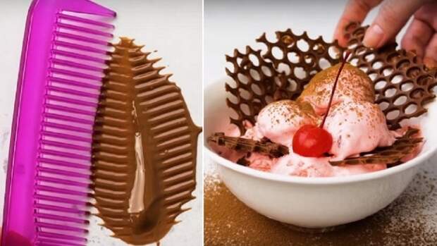 Даже готовя дома, хочется сделать блюдо оригинальным и неповторимым. С этим простым приемом, для которого понадобится только растопленный шоколад, нож и пергамент, это не займет много времени. Чтобы украсить десерт или торт листиками, нужно макнуть нож в растопленный шоколад, сделать мазок на пергаменте для выпекания, а потом обычным гребешком с двух сторон сделать прожилки. После этого пергамент нужно отправить в морозилку, чтобы шоколад застыл, а затем чистым ножом аккуратно снять полученное украшение.