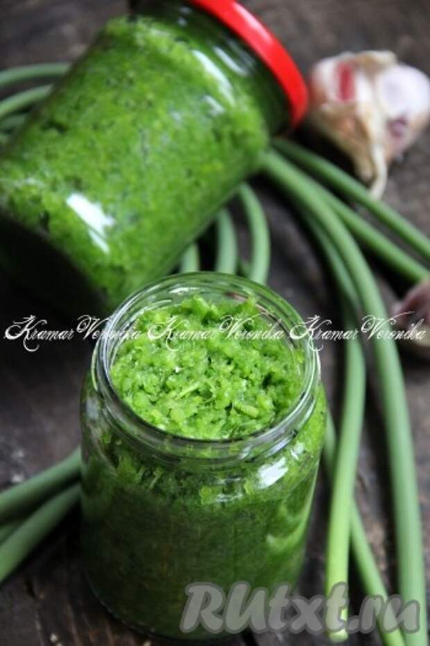 Закрыть банки крышками и убрать в прохладное место (я храню в холодильнике). Приправа, приготовленная из чесночных стрелок, станет отличным дополнением ко многим блюдам в холодные зимние дни и порадует прекрасным ароматом и яркими красками.